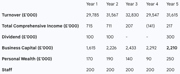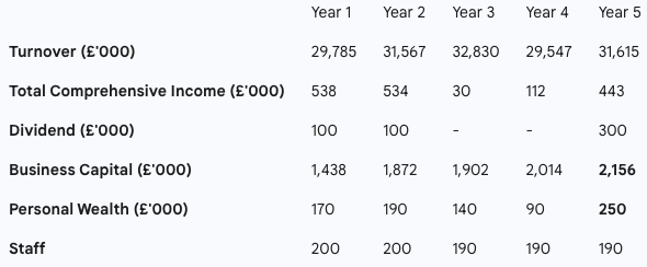 Result: Zombie Business. The additional staff cost from the 2% payroll tax hike hits the bottom line hard. The business capital is now flat by Year 5 (£1.22 million). The business is unable to build capital, cannot grow, and risks falling “hostage to the lender not willing to refinance” its debt. The business owner is unlikely to risk taking the large dividend in Year 5.