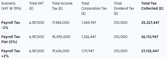 Insight: For profitable businesses, a 2% payroll tax increase adds around £1 million in tax collected. However, this gain comes at a cost: